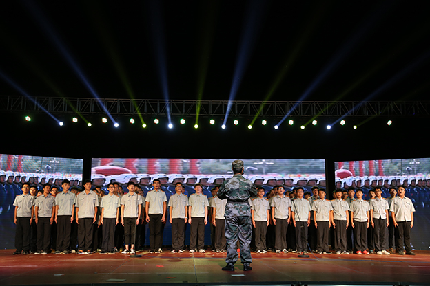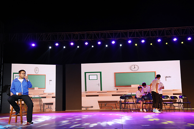 在炫丽的灯光和全场的热情中,晚会以情景演绎《全新一天》开场,将当下社会热点和新生入学军训侧影相结合,讲述16级的新生们,在逐梦的路上,与“全”世界相遇,既忐忑不安又好奇憧憬的心情。