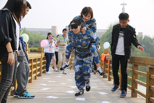 在“强渡大渡河”关卡上,星火队的队员喊出“星火燎原,勇往直前”的口号,激励队员们前行。在渡河过程中,需要队员们互相配合,两两结合背起队友,蒙眼接力前行。在这期间,队员不单单是要面对眼前的黑暗,还要面对脚下的“炸弹”。需要信任背上的队友,听他指挥,一步一步避开脚下障碍,完成任务。工作人员全程跟随,保障参赛人员的安全。