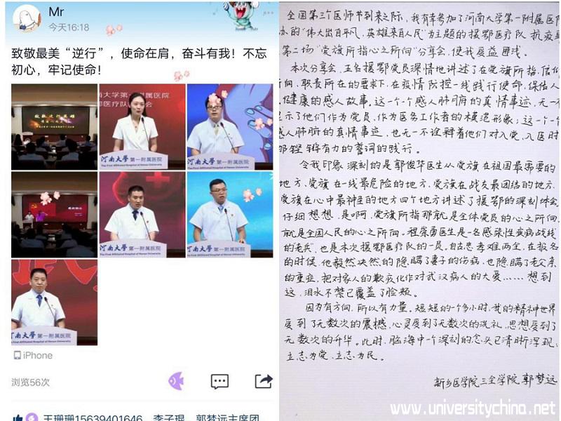 8月19日是全国第三个医师节,为进一步弘扬抗疫精神、彰显医务工作者护佑人民健康的职责使命,传递战疫正能量。新乡医学院三全学院智行书院“情疫守梦之旅”暑期社会实践团队,奔赴河南大学第一附属医院,参与该院援鄂医疗队第二期“党旗所指心所向”主题分享会,并通过网络直播的形式向书院全体学生进行实时转播。