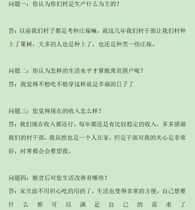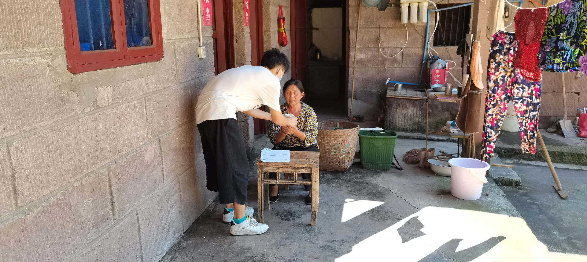 对于腿脚不便的村民,团队成员也是富有爱心,为其递水,搬板凳,帮助做一些力所能及的事。通过走访调查,我们了解到,村民当前的生活状况有了明显改善,对现在的生活十分满意,认为业余生活丰富了许多,同时也有更多闲暇时间陪伴家人了。村干部也会时不时地看望脱贫户,关注关心他们的生活。总之,村民们对于脱贫的效果还是十分满意和认可的。我们也十分的希望这些脱贫村民的生活能够更上一层楼,走向一个更加美好的明天!