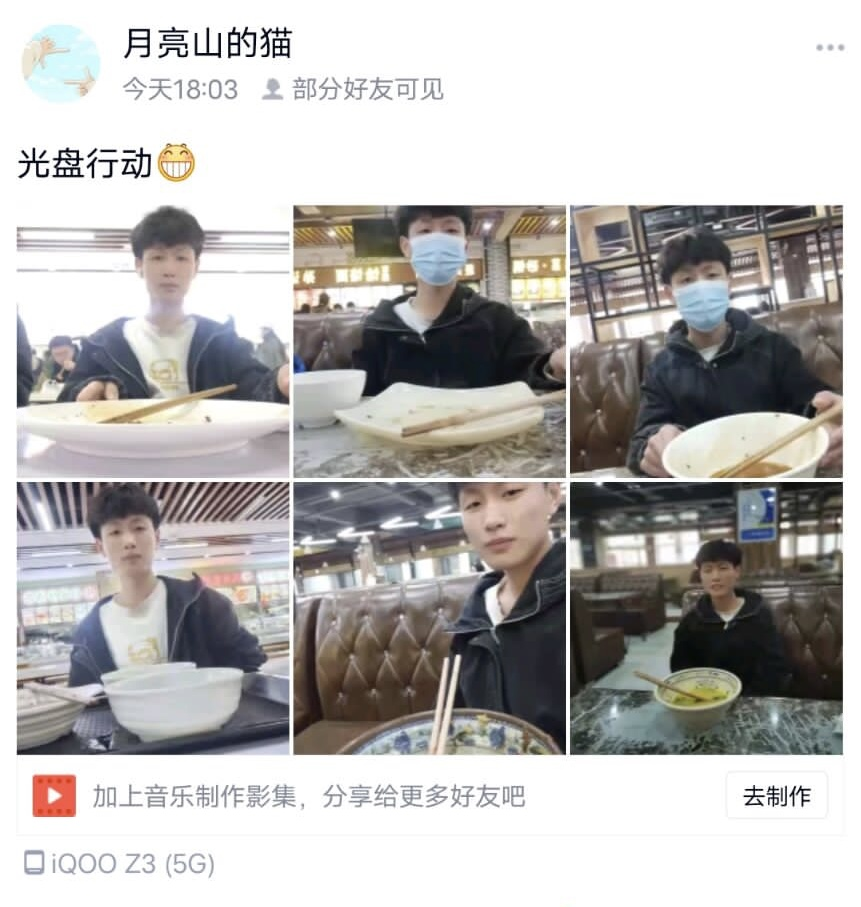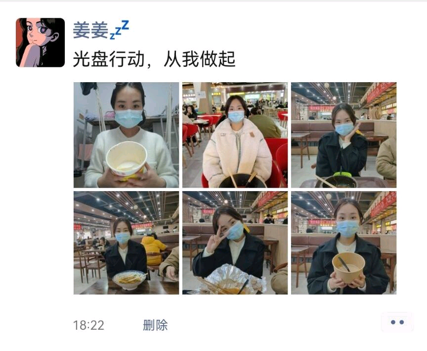 本次志愿服务面向新老校区全体在校学生开展,志愿服务前期,志愿者们积极讨论在疫情防控下怎样才能使服务更好的开展,发布宣传说说,呼吁学生加入此次志愿服务。一系列工作有序开展。服务中期,志愿者积极履行光盘节约的原则,并按要求上传光盘打卡照片。后期,通过线上形式收集照片和志愿者信息,既圆满完成了本次志愿服务,又避免了疫情下人员的聚集。