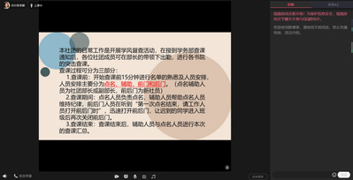 第二部分为日常工作活动。该社团主要的任务是开展学风督查活动,在接到学务部查课通知后,各位社团成员可在部长的带领下出勤,进行各书院的突击查课。