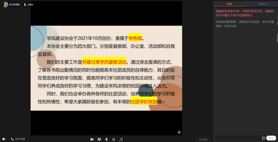 2022年3月19日,下午四点整,由学风建设协会会长张亭毅、副会长李凯歌利用QQ群里的群课堂准时开启了本社团下学期的第一次社团活动--学风建设协会线上见面会议。本会议分为三个部分,分别是社团介绍,日常工作活动,以及社团活动。