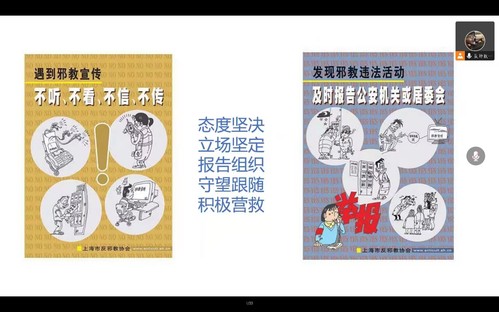 由于疫情原因本社团通过线上见面会的形式向大家分享本社团的理念思想。短暂的社团介绍后会有问卷调查环节,简单的了解同学们的反邪教意识。然后为大家进行ppt的展示介绍邪教的危害,在展示之余会为大家播放小视频,向大家普及反邪教知识增强同学们的反邪教意识。