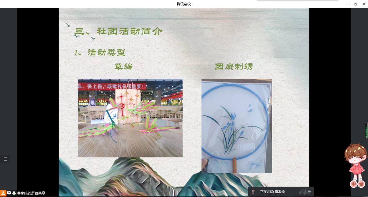 由于疫情原因,本次活动通过线上腾讯会议形式开展。活动分为两个部分,分别是社团和活动介绍以及手工视频的观看。活动开始前由工作人员组织参加活动的同学签到。第一个是社团及活动的介绍,传统DIY手工社旨在通过体验不同传统手工艺的做法,感受中国优秀的传统文化。社团曾举办过手链编制,团扇刺绣,奶油胶制作发卡,手工草编,褶皱花制作等特色社团活动。让更多喜欢手工制作的同学能加入我们,一起体验并交流做手工的乐趣。接下来是观看手工制作视频,本次主要观看褶皱花、草编和线编的手工艺制作视频。在褶皱花制作视频中我们可以看到有玫瑰、郁金香、绣球花、蜀葵花、葡萄风信子等多种精美的花束。它们最初都是普通的纸张,但是在制作者的手中变成了一枝枝精美的花朵,变得更加的赏心悦目。其次就到了草编的制作。一根根草编棍最终成了蚂蚱、蝴蝶、蜻蜓等有趣的小动物的形状,就好像被注入了灵魂,顿时变得更加生动。最后是线的编织,视频中详细介绍了如何编织精美的手链。从开始的准备到穿线的手法让人眼花缭乱但是又能勾起同学们动手的兴趣。我想,这就是传统手工的魅力之在吧。