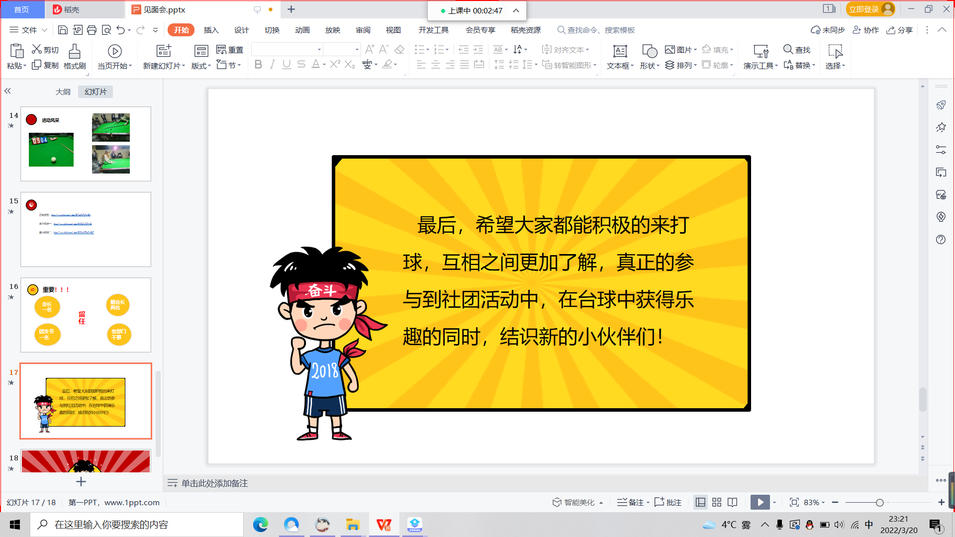 2022年11月16日周三晚六点台球协会举办“线上见面会”活动,本次活动时长为四十分钟参与人数达到八十人。本次活动加深我们社团成员对我社团的了解及认识,促进成员之间的情感交流,并调动大学生对于台球的兴趣和积极性,鼓励大学生在遇到心理问题时能够进行自我调适或寻求帮助。