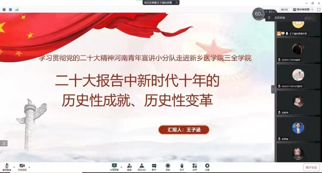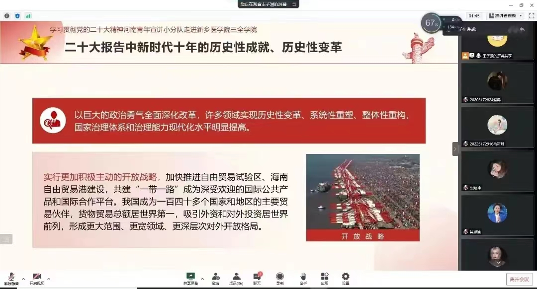 为深入学习宣传贯彻党的二十大精神,把全校青年的思想和行动统一到党的二十大精神上来,持续推动党的二十大精神在全校青年中入耳入脑入心。根据《中共中央关于认真学习宣传贯彻党的二十大精神的决定》要求和《共青团中央关于全团认真学习宣传贯彻党的二十大精神的通知》《共青团河南省省委关于认真学习宣传贯彻党的二十大精神的通知》部署,11月15日下午,学习贯彻党的二十大精神河南省青年宣讲小分队成员、我校团委教师王子涵,于线上开展二十大精神宣讲。