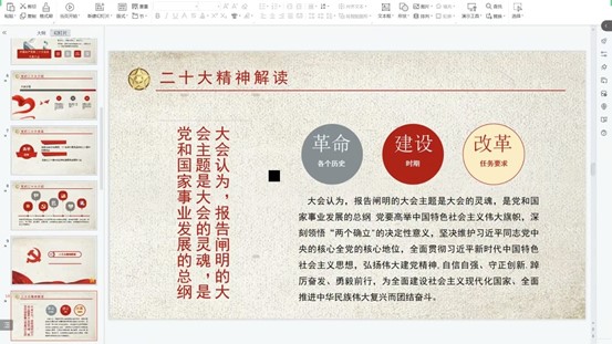 我校理论学习进社团活动顺利开展,圆满结束。参与活动的同学们深感受益匪浅,通过这一系列的活动,同学们感受到了学习贯彻党的二十大精神,就要深刻把握全面建成社会主义现代化强国总的战略安排和未来五年的主要目标任务,牢牢把握“坚持和加强党的全面领导”“坚持中国特色社会主义道路”“坚持以人民为中心的发展思想”“坚持深化改革开放”“坚持发扬斗争精神”的重大原则,埋头苦干、担当作为,不断推进社会主义现代化建设。