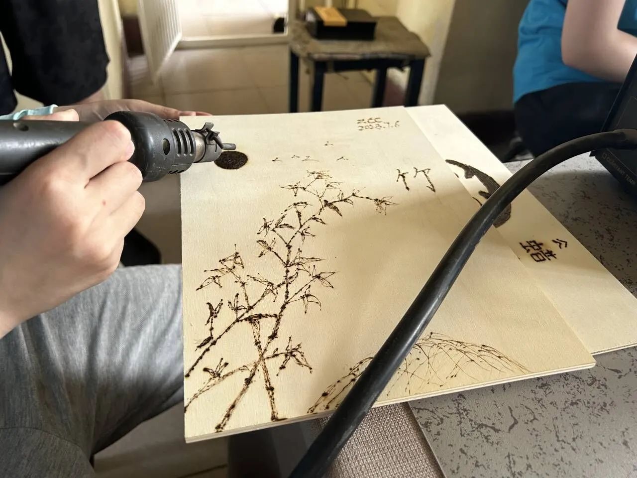 走进工作室,映入眼帘的便是那摆放在最显眼位置的葫芦烙画。张老师为队友们讲述了他与每一个葫芦烙画的故事。随后,张老师拿出了练手的木板向团队演示起来,他用手指在木板上比划着,讲解着构图和留白。在张老师细致有趣的讲授下,队友们纷纷开始着手烙画,看着电烙笔冒出的缕缕青烟,张老师提醒道“到这个程度再等三分钟就可以开始着手烙画了”。下笔前实践团的每位成员都信心满满,直到看到自己甚至无法画出一条流畅的线条,实践团不禁发出“太考验技术了”的感叹。