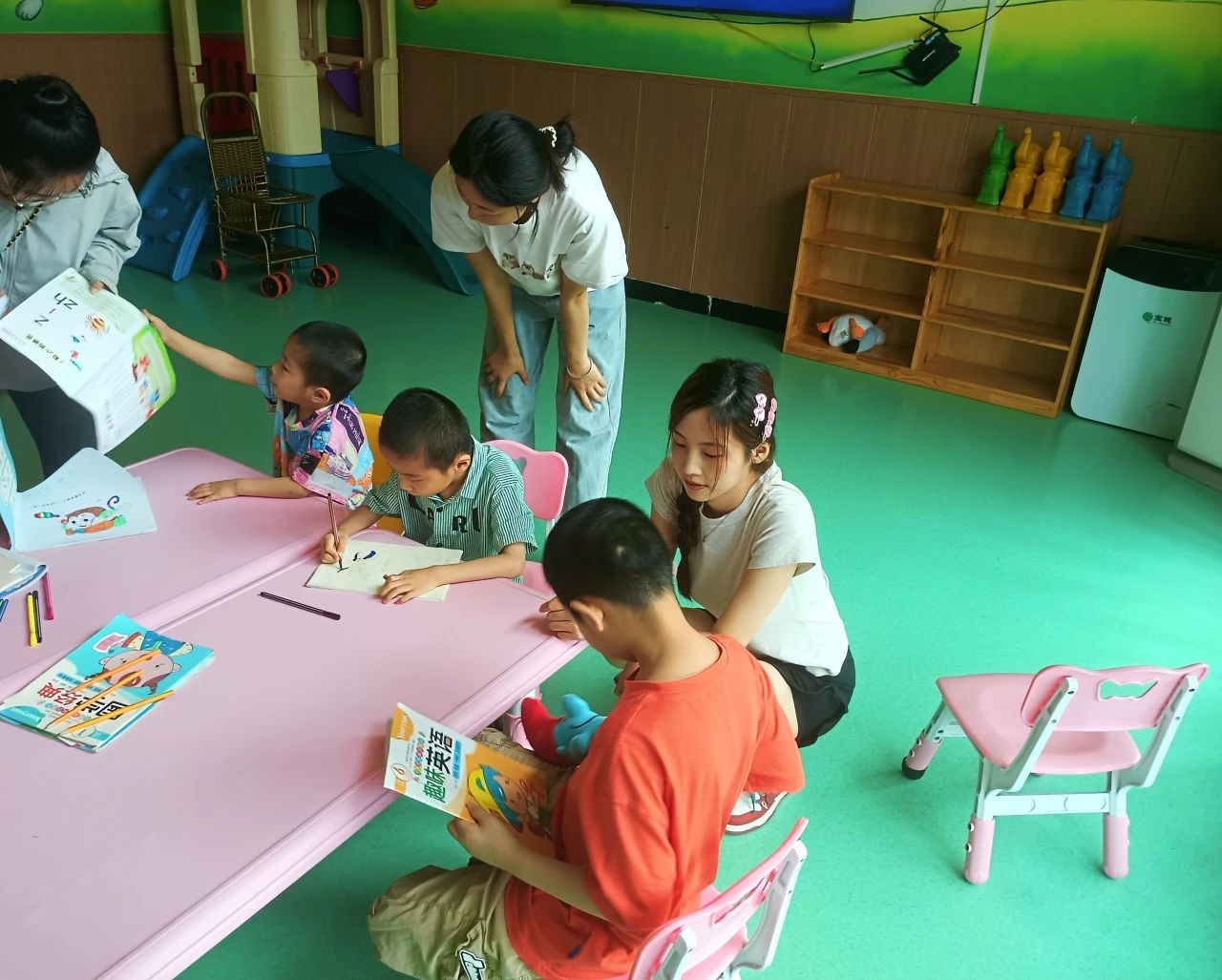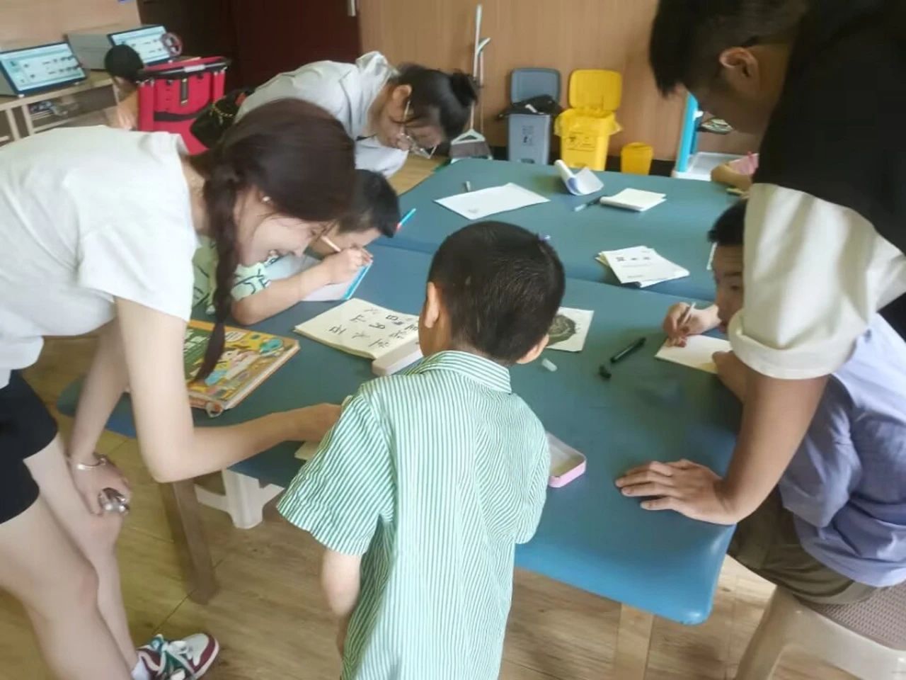 里面的工作人员简单介绍了福利院的相关情况,随后四名同学来到了三楼的儿童活动室。志愿者们抱着孩子们聊天、一起画画、一起玩游戏,教孩子们如何写书法字,辅导读儿童读物。里面的孩子非常的热情,积极和志愿者交流和互动,孩子们还会给志愿者们展示自己写的字和画的画本。