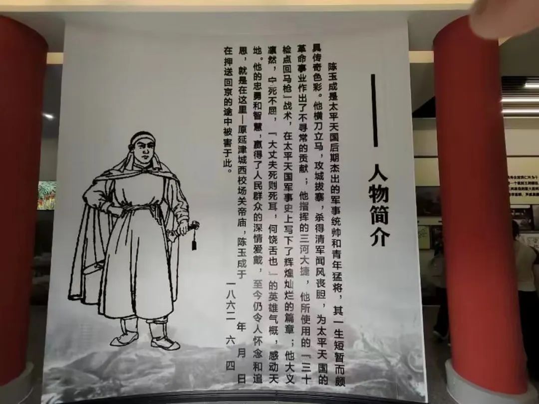陈玉成(1837—1862),广西藤县人,十四岁参加太平天国金田起义,十八岁领兵作战,英勇杀敌,在太平天国后期,取得三河大捷,以功封英王,后屡建奇功。1861年7月,曾国藩勾结英国海军,攻陷了安庆,陈玉成退走寿州,误中叛徒苗沛霖的奸计被俘,1862年6月4日,在押送北京途中,路经延津时被清政府杀害于县城内西南西校场,牺牲时年仅二十六岁。陈玉成牺牲后,太平天国即在军事上失去了一个杰出的统帅,也在经济上失去了物质的来源,因此不到两年天京就告失陷,一场轰轰烈烈的农民战争就此宣告失败。虽然太平天国运动失败了,但它对封建统治的反抗、对政治变革的影响以及对中国现代化进程的启示都产生了深远的影响。