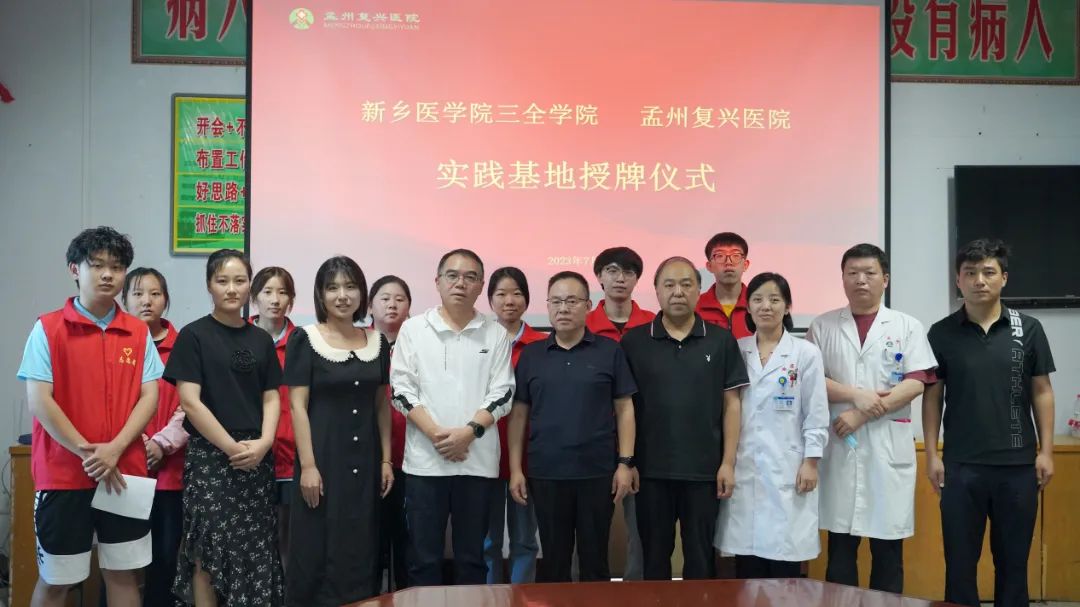 为进一步加强学生实践教育,不断丰富拓展学生学习实践形式内容,深化医校合作,7月18日下午,智行书院暑期社会实践基地挂牌仪式在孟州市孟州复兴医院举行。我校党委副书记杨国平、智行书院团总支书记孙媛慧,孟州复兴医院副院长卢卫东、李文峰、杨保华、医务科主任兰天、外三科主任闫生伟,医院医务工作者代表及智行书院“情暖复兴 青春助行”实践团师生出席本次仪式。本次挂牌仪式的顺利举行,是智行书院社会实践平台的有力扩充,基地的建设为书院学生提供了社会实践大课堂,不仅有利于推进书院社会实践工作的建设和发展,还有利于提升智行学子专业实践能力和社会服务能力。