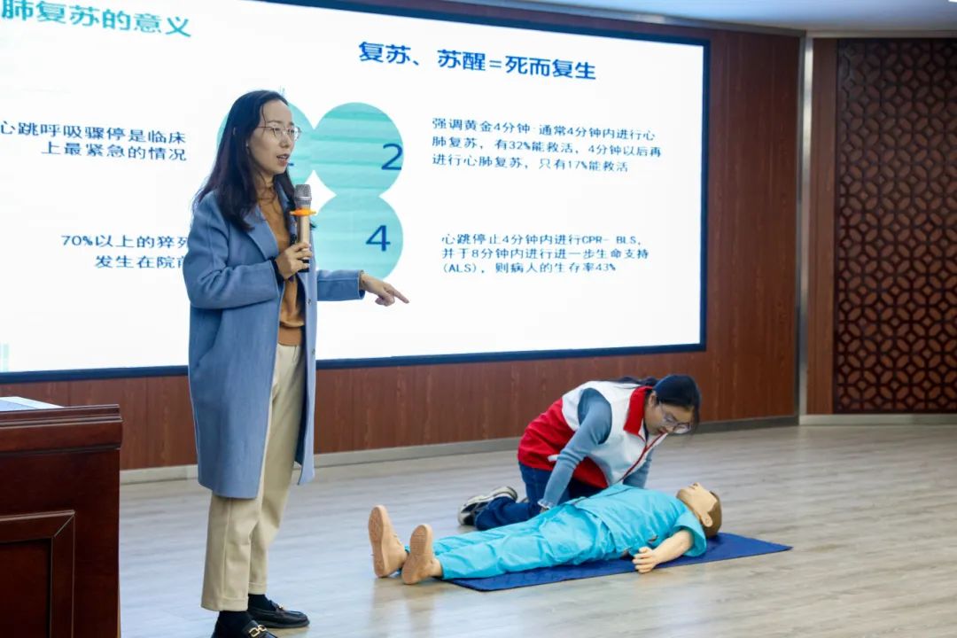 随后进入实操环节,在实际操作培训中,志愿者们将参训老师分成6组采取“小班教学”,每组由两位志愿者进行示范和逐一指导,做到在场的老师人人都能亲自体验,个个都能操作过关。“将患者平放于硬板床或平整地面上,解开衣物。按压部位:两乳头连线中点……”德馨书院志愿者张乐琳正在利用模拟人熟练地进行急救知识、操作方法的现场演示、辅导,通过这种方式,让参训老师学习急救的基本知识,掌握急救的基本技能。
