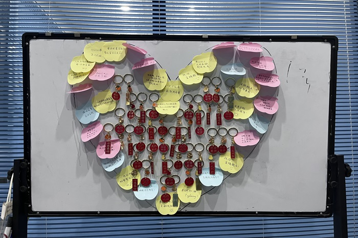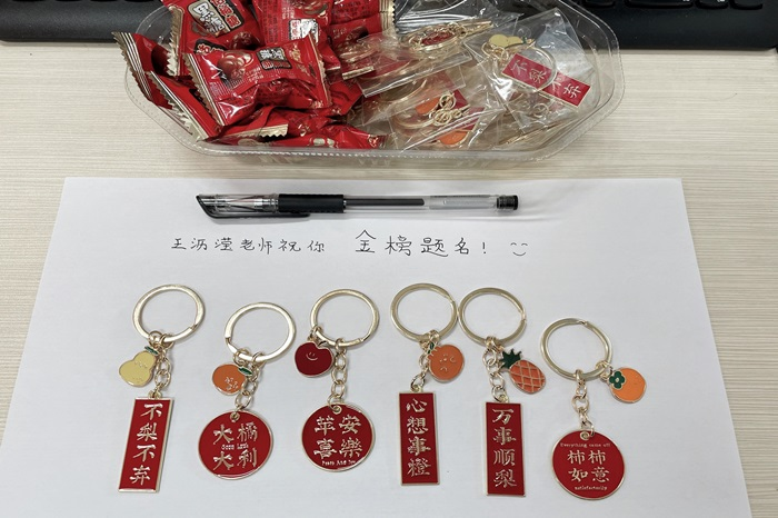“乾坤未定,你我皆黑马”“人生没有白走的路,每一步都算数”“加油,祝你金榜题名”“一战成‘硕’!”“一鸣从此始,相望青云端”······崇德书院功能区的留言板上,贴满了辅导员亲自写的鼓励话语,字里行间蕴含着对考研学子的祝福、关心和支持,表达了老师们的殷切期望和美好祝福。辅导员为考研学子赠送心想事“橙”、万事顺“梨”、“柿柿”顺利等钥匙链,寓意同学们成功上岸,未来可期,并鼓励他们增强信心,全力以赴,以良好的心态应对挑战,取得最后成功。礼物虽轻,但却寄托着老师对考研学子们的亲切关怀。考研学子备受鼓舞,纷纷表示一定会尽自己所能全力备考,以最佳的状态迎接考试,不辜负学校的关心照顾和一年以来自己的付出,奋勇前进!