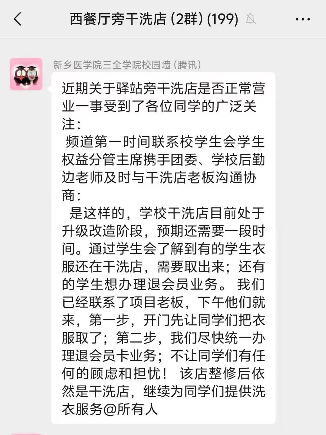 自学期伊始,干洗店的关闭便引起了学生的不安与疑虑,大家在多个网络平台上表达了自己的不满和担忧。对此,校学生会学生权益部立即通过QQ频道、权益反馈群等渠道收集信息,并进行了实地调研。在冷静分析事态的基础上,权益部主动承担起沟通桥梁的角色,与学校后勤服务中心以及干洗店负责人进行了多方协商。最后了解到,干洗店因为假期装修延期再加之店长家中有人住院,店中人手不够等诸多事宜一再将开门时间延期,在协商中学校后勤服务中心边主任也强调了不能因为店家自己的原因过多延误学生应有的服务时间,要让学生用的安心,洗的放心。在多方协商写,最终敲定于9月3号当天下午重新开门,因人手不够和装修等因素,可逐步开放洗衣等服务功能,当天有取出寄存衣物需求的同学可以完成了取衣服务。