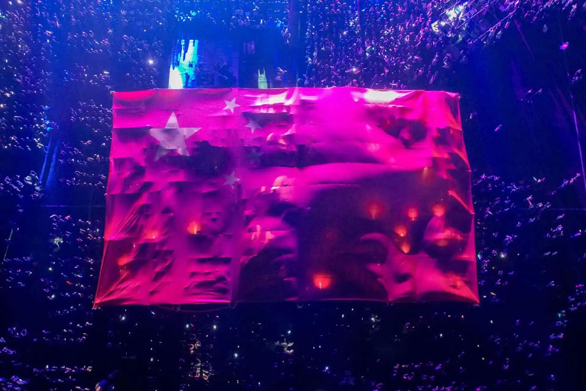 “五星红旗迎风飘扬,胜利歌声多么响亮,歌唱我们亲爱的祖国,从今走向繁荣富强……”晚会在大合唱“歌唱祖国”的歌声中落下帷幕。万余名三全师生齐声合唱《歌唱祖国》,伴随着现场气势磅礴的歌声,一面长30米宽20米的国旗在现场开始传递,场内的师生高高举起双手共同接过并撑起这面巨大的五星红旗……音乐声中,鲜艳的五星红旗在场内缓缓展开,万余名师生的欢呼声经久不息。
