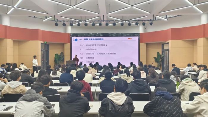 周艳琳首先为同学们梳理了我们可以参加的各类科研竞赛与项目,展示了丰富多彩的科研舞台。随后,她逐一解析了各类竞赛与项目的核心特点与差异,帮助同学们明确目标、精准定位。通过展示优秀的项目标书与获奖竞赛PPT,周艳琳详细传授了撰写项目书与制作PPT的技巧,从内容组织到段落安排,都给出了详细指导。她鼓励同学们在组建科研团队时跨越专业界限,发挥各专业的优势,共同打造高质量的项目书与PPT,并在完成后寻求辅导员或学业导师的专业指导。周艳琳还特别强调,在路演过程时,PPT的内容展示往往比项目书更为关键。