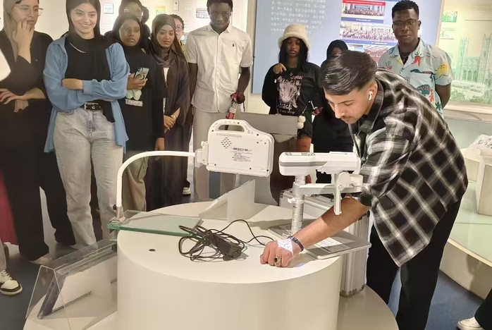 师生们深度探访了古代医疗器具馆、中国麻醉博物馆和医疗器械馆。从战国青铜手术刀的精密设计、宋代针灸铜人的科学智慧,到智能化麻醉设备的精准调控,再到微创介入导管、可穿戴心电监测智能衣等“中国智造”明星产品,一条从历史积淀到技术追赶、并跑乃至领跑的清晰脉络展现在眼前。来自摩洛哥的学生爱莎在对比古今器械后感叹:“古人的智慧令人惊叹,而现代设备的精密更体现了中国在医疗科技领域的飞速进步和强大创新能力。”