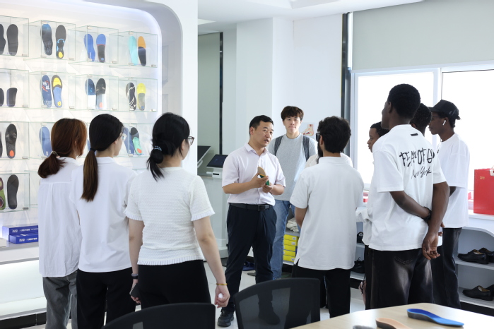 生产线观察窗边,机械臂正往模具中注入糖尿病足鞋垫液态原料。尼日利亚的学生阿布感慨:“非洲亟需这种普惠医疗科技!原来‘医者仁心’不仅治病,更在科技中延续。”