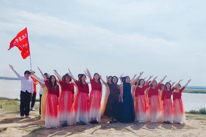 在奔腾的黄河岸边,实践团搭建起充满创意的露天舞台。豫剧名家汤玉英与队员们共同演绎了气势磅礴的《保卫黄河》。汤老师将豫剧独特的唱腔韵味融入这首经典抗战歌曲,与队员们嘹亮的合唱声完美融合。