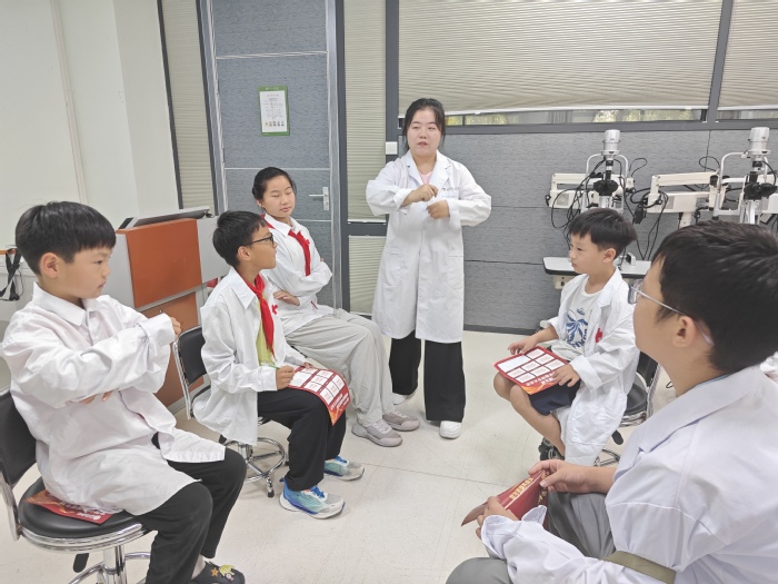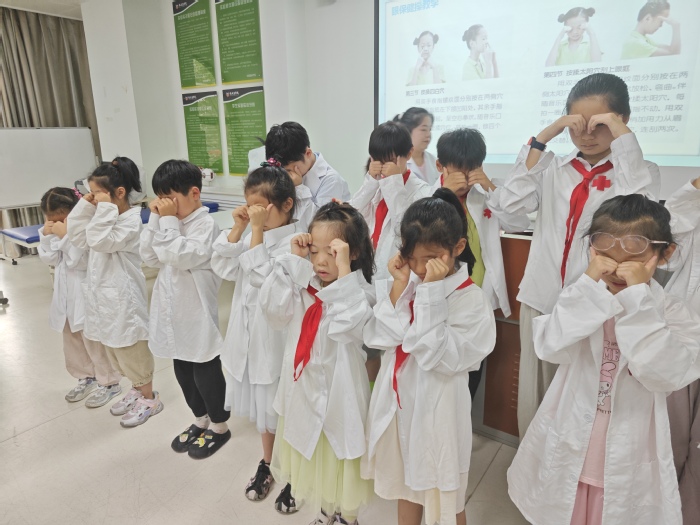 “我摸到眼球模型啦!” 在眼视光学院,孩子们套上洁白的医生袍,摇身变成 “小医生”。志愿者王荣、贾薇化身 “知识导游”,将晦涩的眼科学知识化作趣味故事,配合验光仪的现场操作,让孩子们亲手体验 “眼睛的奥秘”。“为什么看久了屏幕眼睛会酸?”“戴眼镜真的能让视力变好吗?” 此起彼伏的提问声里,藏着一颗颗渴望探索的童心。而在医学影像学院,志愿者张涵哲则带领 “小医生” 们走进 “黑白世界”。CT 扫描仪嗡嗡作响,MRI 设备闪烁着神秘蓝光,随着志愿者深入浅出的原理科普,孩子们的指尖轻轻触碰冰冷的仪器外壳,仿佛触摸到医学科技跳动的脉搏,抽象的医学概念瞬间变得鲜活可感。