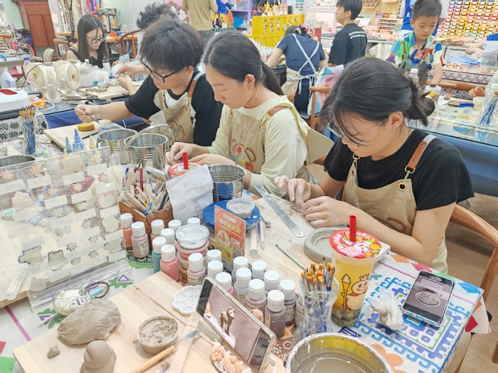 带着前三日的观展震撼,实践队员们走进陶艺工坊,开启为期两天的创作实践。实践队员张富真选择以“莲鹤方壶”的仙鹤造型为原型,尝试用拉坯工艺重塑灵动姿态,但初次尝试便因壶颈过细而开裂。“传统工艺的精湛远超想象,每一道工序都需要手感与经验的结合。”他在反复调整泥料湿度后,终于完成了仙鹤头部的雏形。团队还开展了“文物纹样创新设计赛”,将汉代画像砖的青龙纹、唐代三彩的宝相花纹等元素融入现代杯盘造型。队员吴怡将甲骨文中的“龙”字变形为茶盏把手,古朴文字与流线型器型形成奇妙碰撞。工坊内,揉泥、拉坯、修坯的声响此起彼伏,空气中弥漫着陶土的湿润气息。当一件件带着手印温度的作品陈列在展示架上时,实践队员沈思译感慨道:“我们的创作或许不够完美,但每道刻痕都传递着自己对传统的理解——这正是文化传承的生命力所在。”