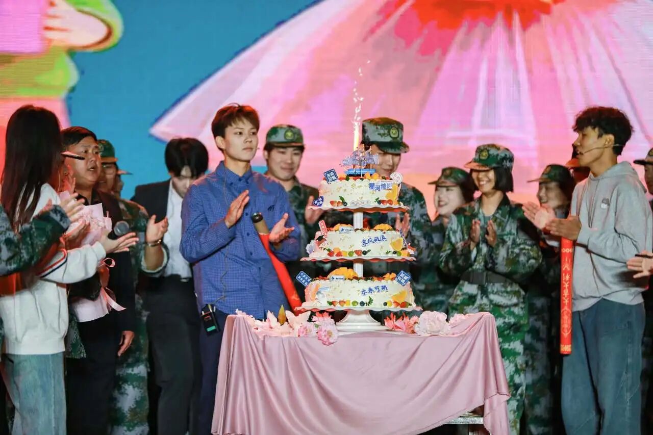惊喜仍在延续。伴随着温暖的生日旋律,一个精心准备的大型生日蛋糕被缓缓推出,受邀上台的寿星新生代表和家长代表在全场师生祝福的掌声中,共同切开了这份满载关怀的甜蜜礼物,让初入校园的学子真切感受到“学校即家”的归属感与幸福感,温情歌曲《陪你穿行岁月》缓缓唱响,轻柔的歌声与现场感人场景相融,将晚会的温情氛围推向顶点。