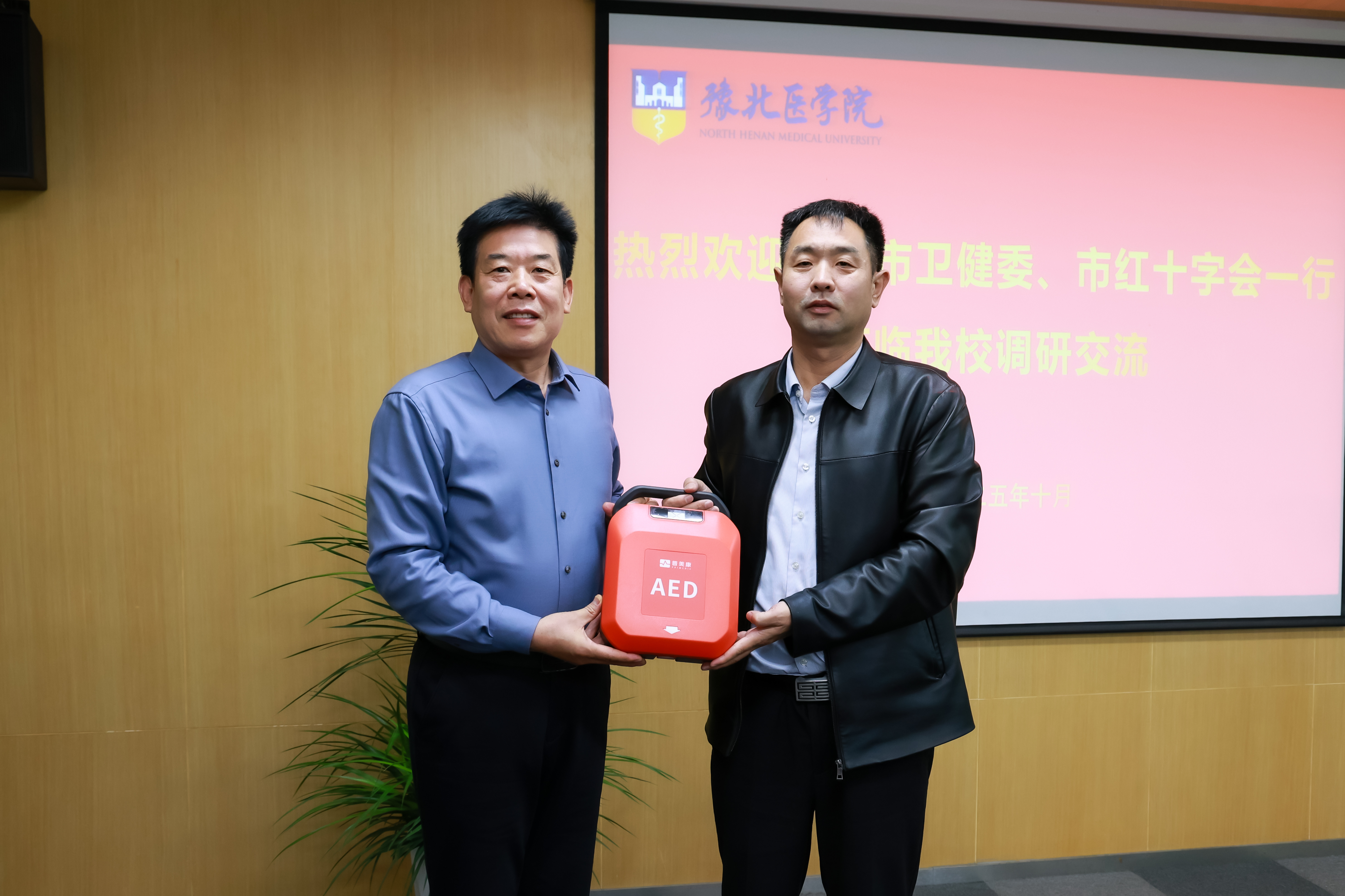 座谈会后,孙涛科代表新乡市红十字会向学校捐赠AED设备,李庚代表学校接受捐赠。此次捐赠的AED设备将进一步完善学校应急救护硬件设施,为师生生命安全增添重要保障,生动体现了市红十字会对高校师生健康的深切关怀。